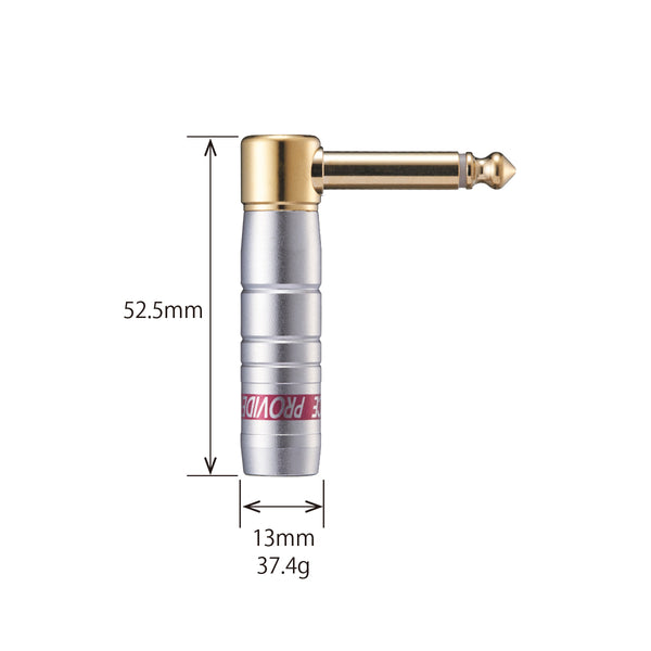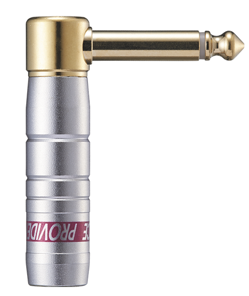 24金メッキ、L型プラグ(ロングタイプ)オリジナル・フォーンプラグ NPシリーズは、プラグ本体、シェルともに真鍮削り出しの日本製高品質プラグです*。製造工程の多くで職人による手作業が必要とされる、まさにハンドクラフト的な製品として仕上げられています。 プラグシャフトはφ6.3mm。製品ごとのばら付きが少なく、ギターなど大多数の楽器で使用されているインチサイズ(1/4インチ)のジャックにジャストフィットすることで抜けにくく、プラグとジャックの接点が多いことで音質にも良い影響を与えます。